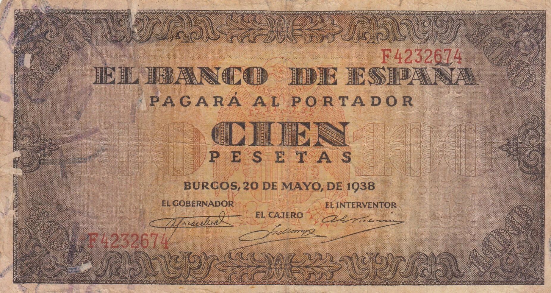 Le billet de 100 pesetas émis en Espagne en 1938, série F, est une représentation tangible de l'histoire monétaire de ce pays. Sa valeur nominale est de 100 pesetas, l'unité monétaire en vigueur à cette époque.