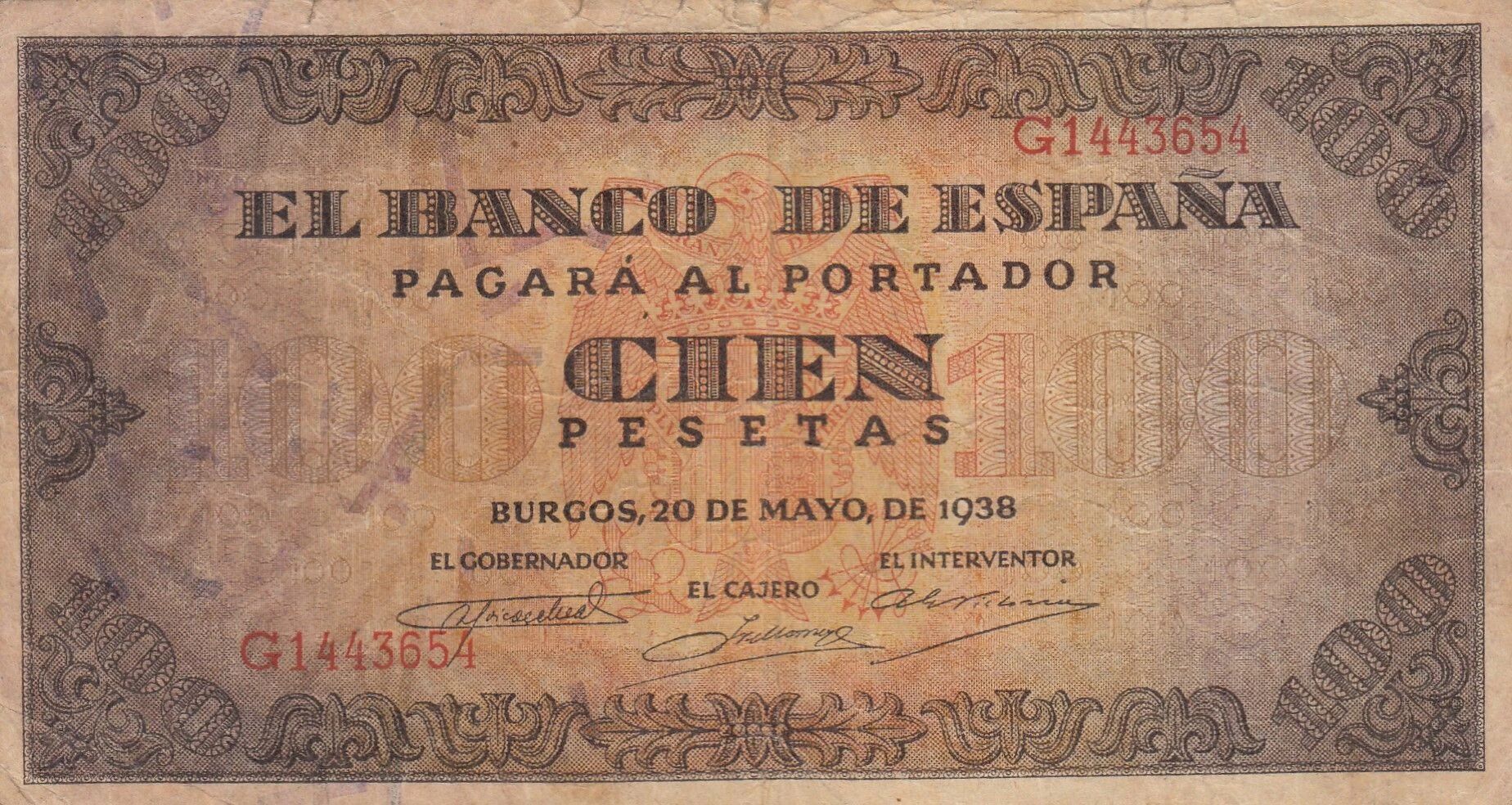 Ce billet de banque espagnol a une valeur nominale de 100 pesetas. Il a été émis en 1938.