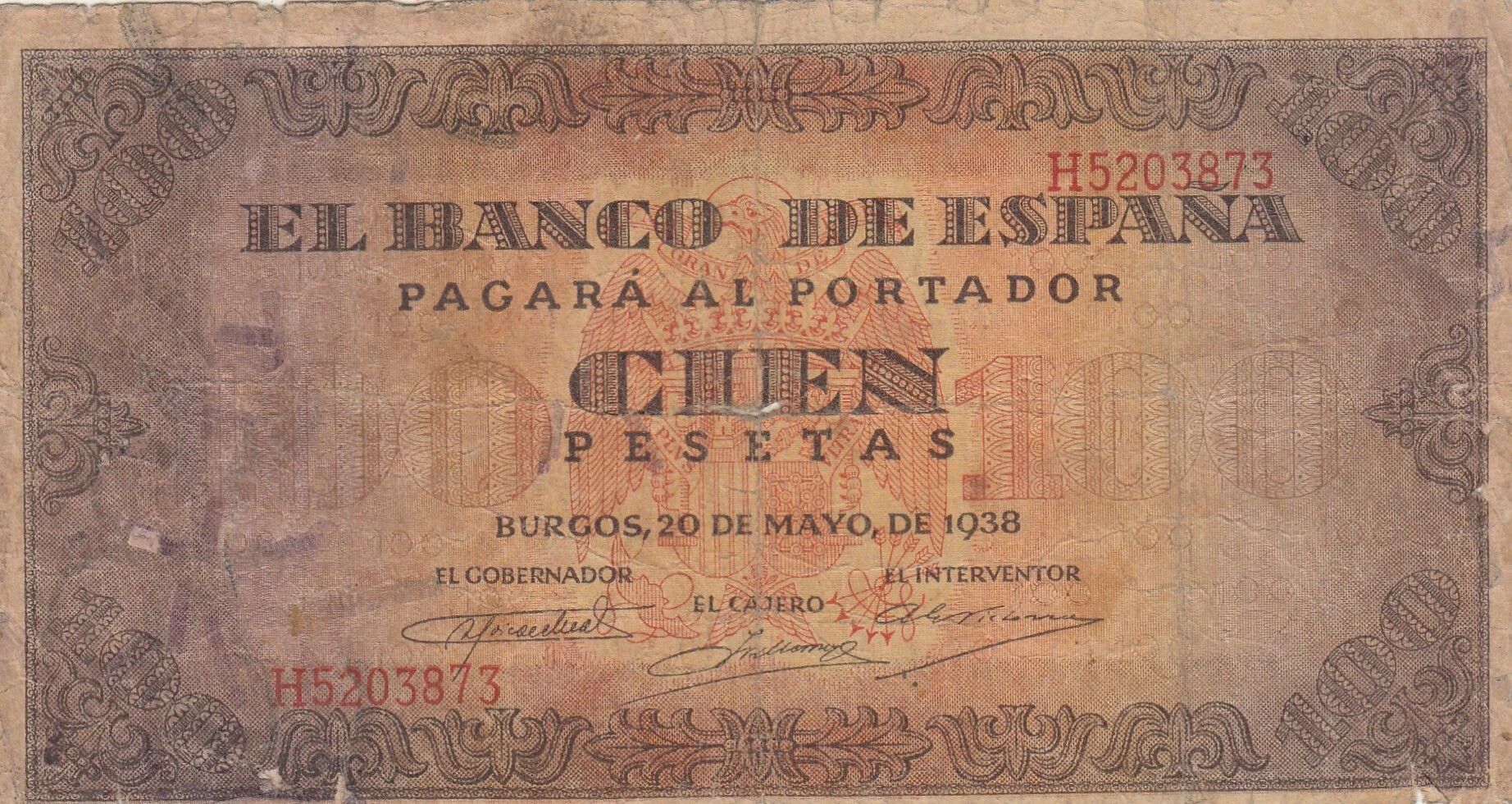 Ce billet de banque espagnol a été émis en 1938. Il représente une valeur nominale de 100 pesetas. Il appartient à la série H.