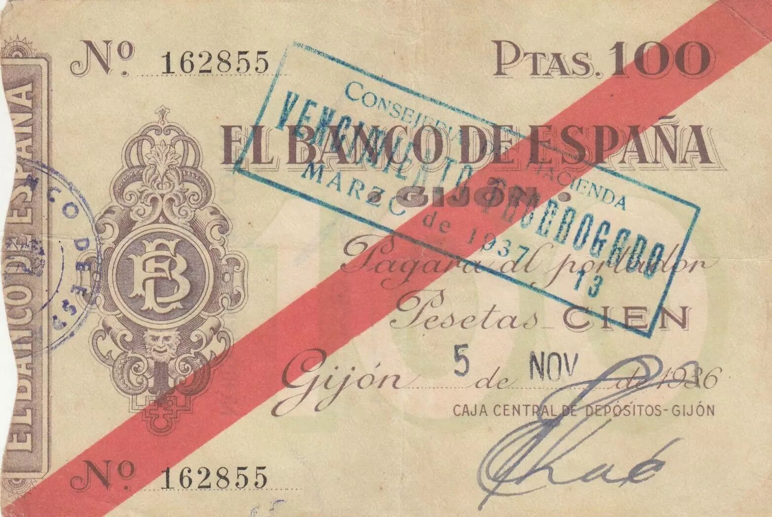Le recto du billet présente des inscriptions en lettres noires, ainsi qu'un monogramme de la Banque d'Espagne positionné sur la gauche. Une bande diagonale de couleur rouge-rose traverse le billet, ajoutant un élément visuel distinctif. On peut lire l'inscription "EL BANCO DE ESPAÑA / GIJÓN" en haut du billet, suivie de la promesse de paiement "Pagará al portador Pesetas CIEN". La date d'émission, "Gijón 5 de NOV de 1936", est également mentionnée. Enfin, on trouve la mention "CAJA CENTRAL DE DEPOSITOS - GIJÓN", identifiant l'institution émettrice.