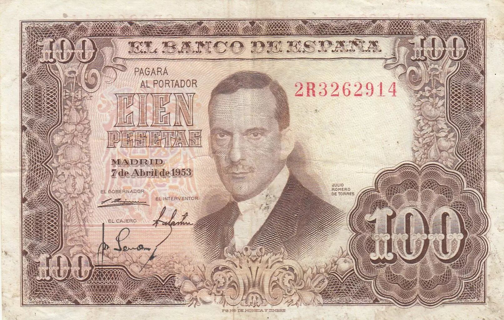 Accueil > Billets du Monde > Billets d'Europe > Espagne > Espagne 100 Pesetas - J.R. de Torres - 07-04-1953 - Série 2R