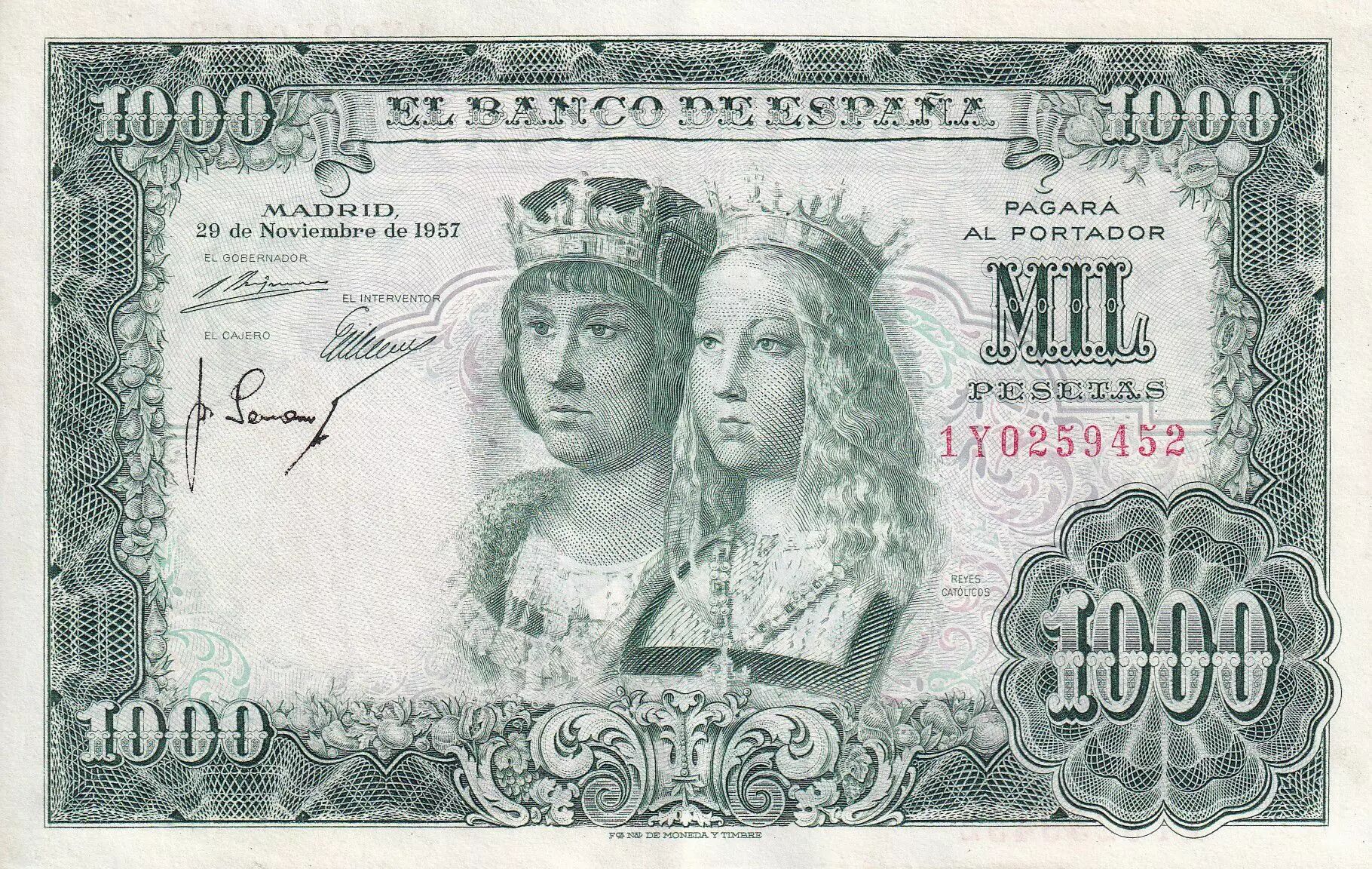 Accueil > Archivage > Espagne 1000 Pesetas - Roi catholiques - Armoiries - 1957 - P.78