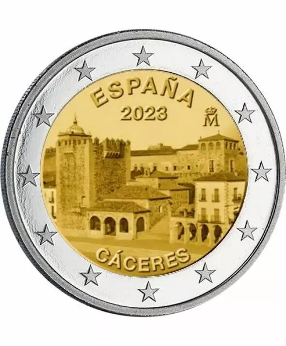 La pièce 2 euros commémorative d'Espagne 2023 est consacrée à la vieille ville de Caceres. C'est la quatorzième pièce de la série annuelle consacrée aux sites espagnols inscrits sur la liste du patrimoine mondial de l'UNESCO.