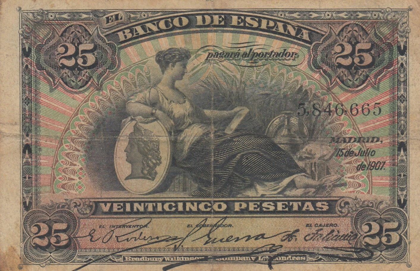 Le billet de 25 Pesetas émis en Espagne en 1907 représente une forme de monnaie fiduciaire de cette époque. Ce billet a une valeur nominale de 25 pesetas, l'unité monétaire utilisée en Espagne à cette période.