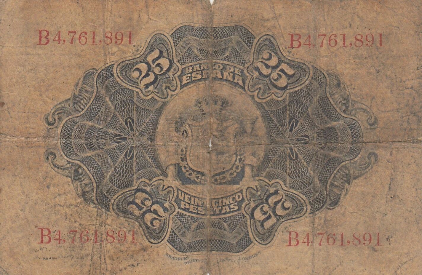 Le recto du billet présente une composition allégorique complexe. Au centre, une femme assise symbolise l'Espagne, drapée et couronnée, tenant une branche d'olivier et s'appuyant sur un bouclier orné des armoiries du pays. De chaque côté de cette figure centrale, des motifs ornementaux et des armoiries supplémentaires complètent le design. La valeur faciale, "25 pesetas", est clairement indiquée en toutes lettres et en chiffres. La mention "El Banco de España" identifie l'institution émettrice. Les signatures des responsables de la banque figurent également au recto, authentifiant le billet.