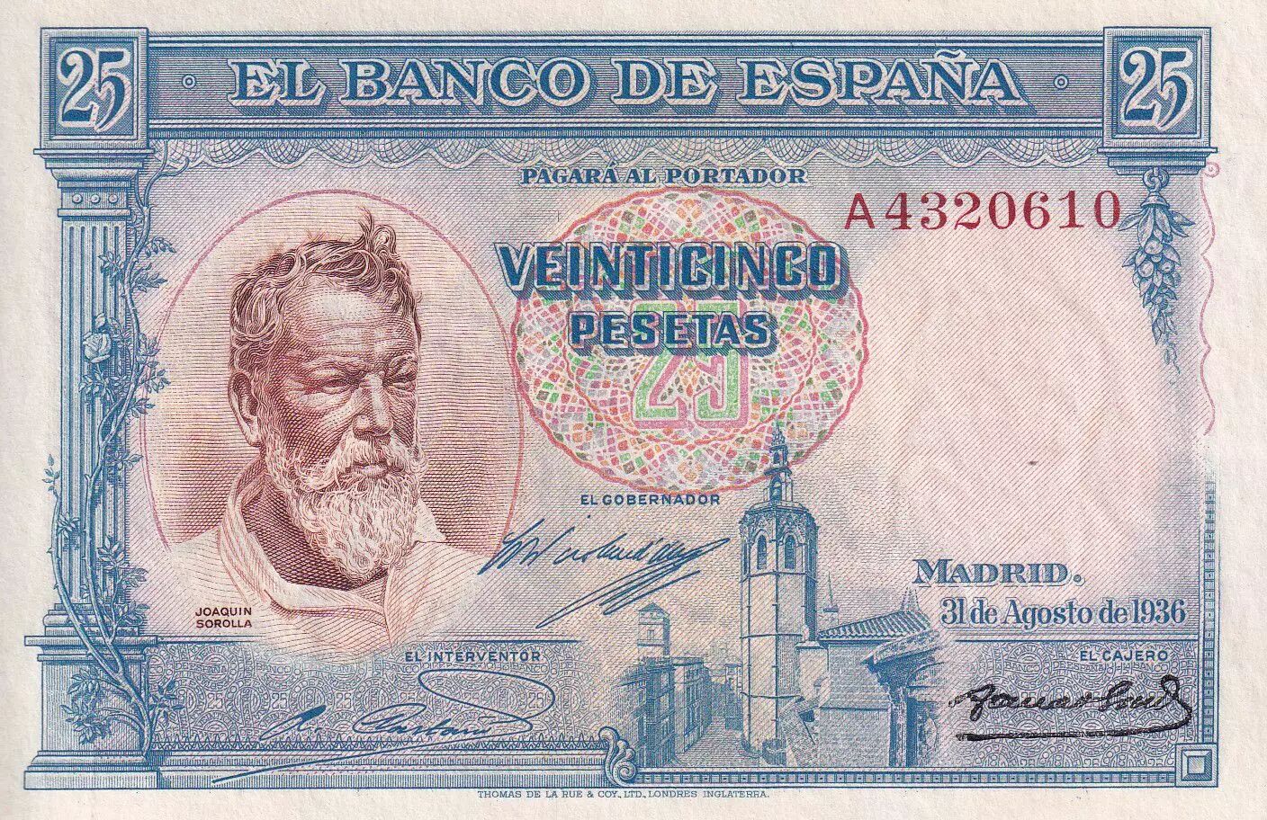 Billet Espagne 25 Pesetas - Joaquin Sorolla - 1936 - P.87b