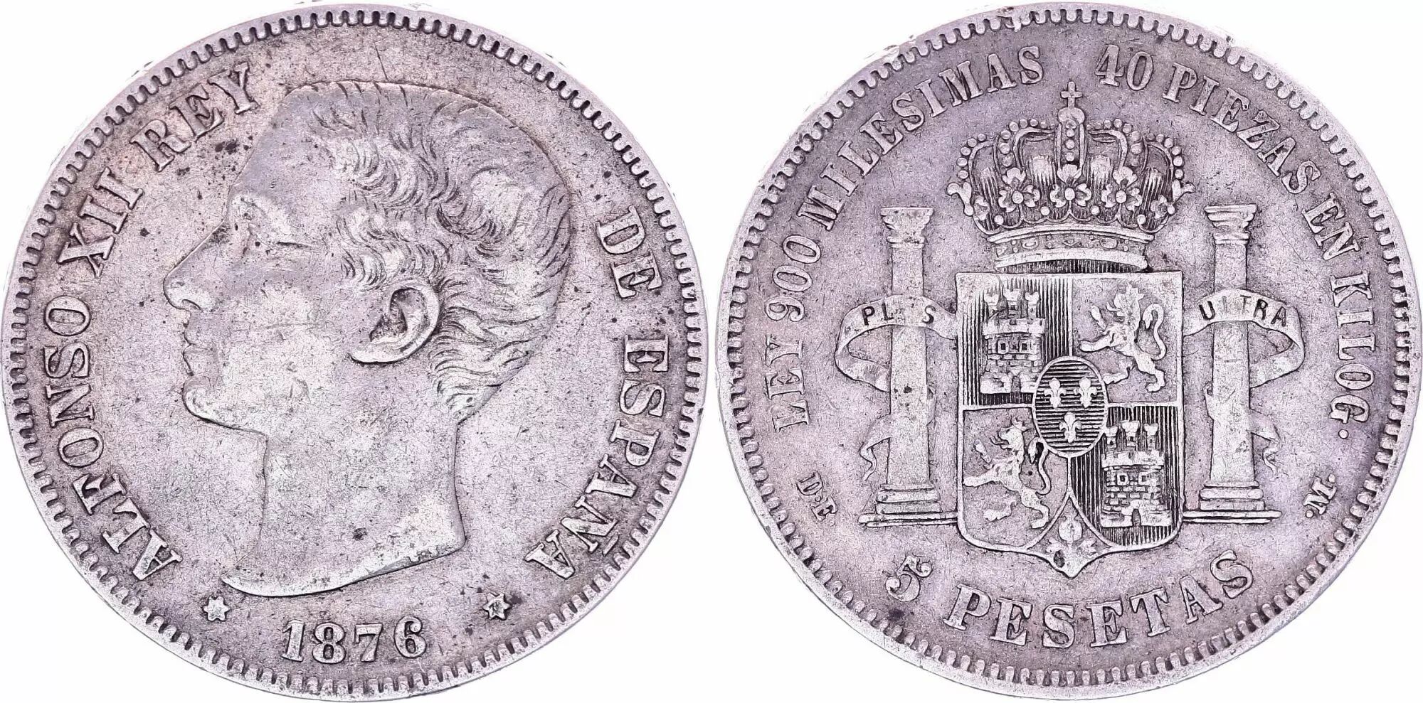 Pièce Espagne 5 Pesetas, Alfonso XII - Armoiries -1876