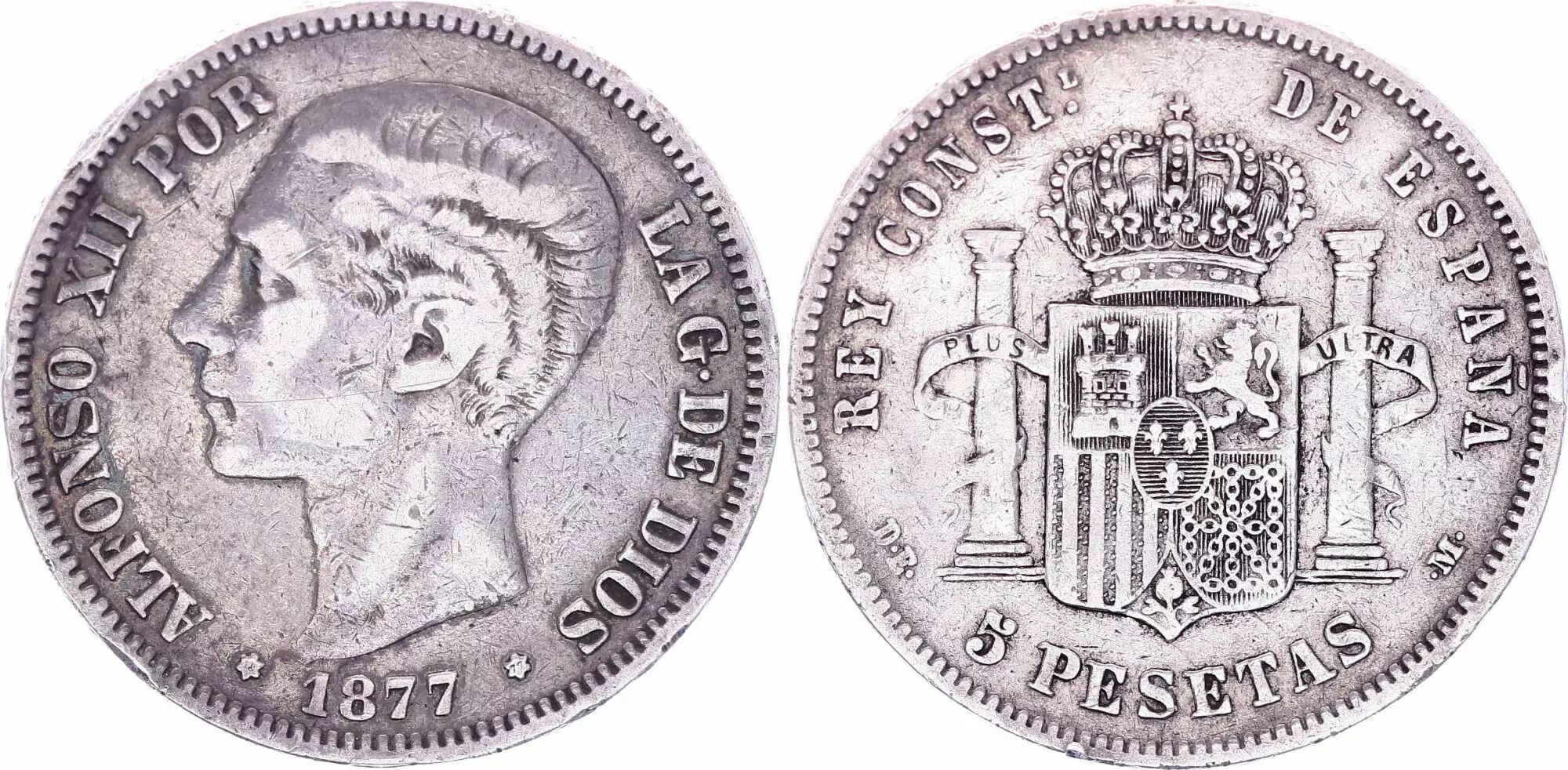 Pièce Espagne 5 Pesetas, Alfonso XII - Armoiries -1877 (77)