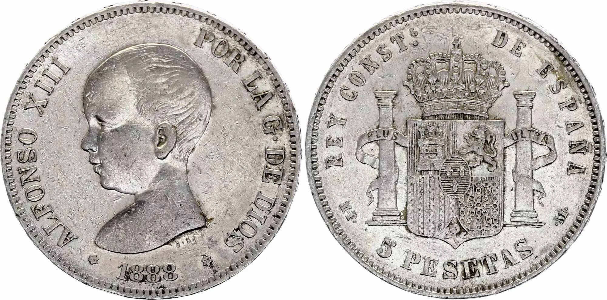 Accueil > Archivage > Espagne 5 Pesetas, Alfonso XIII - Armoiries - 1888 (88) MP-M