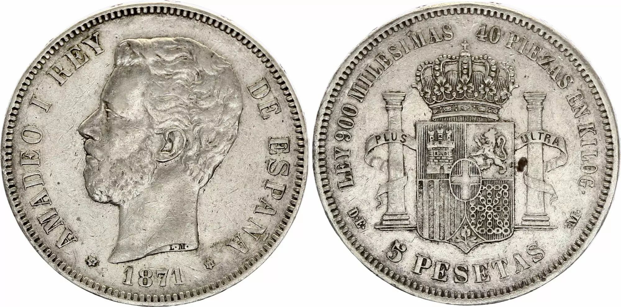 Pièce Espagne 5 Pesetas, Amadeo 1er - Armoiries - 1871 (74) DE-M