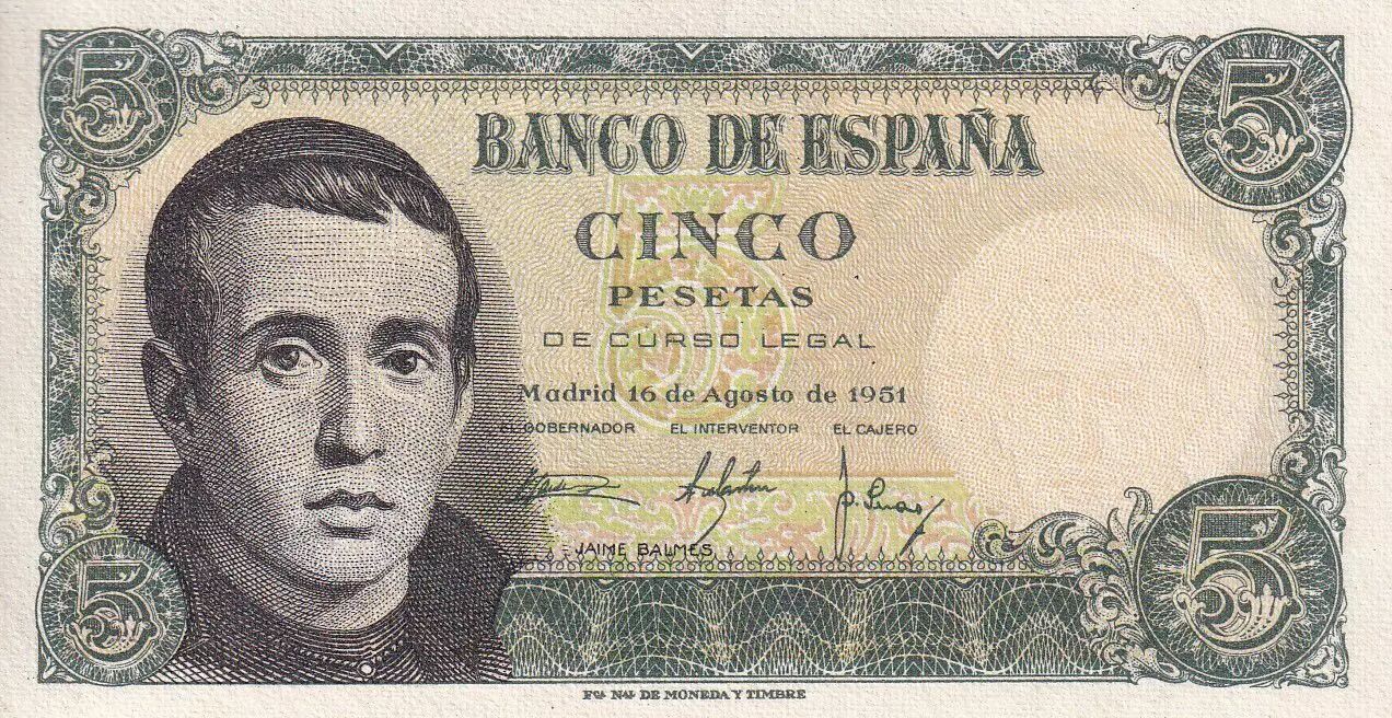 Accueil > Archivage > Espagne 5 Pesetas - Jaime Balmes - 1951 - P.140