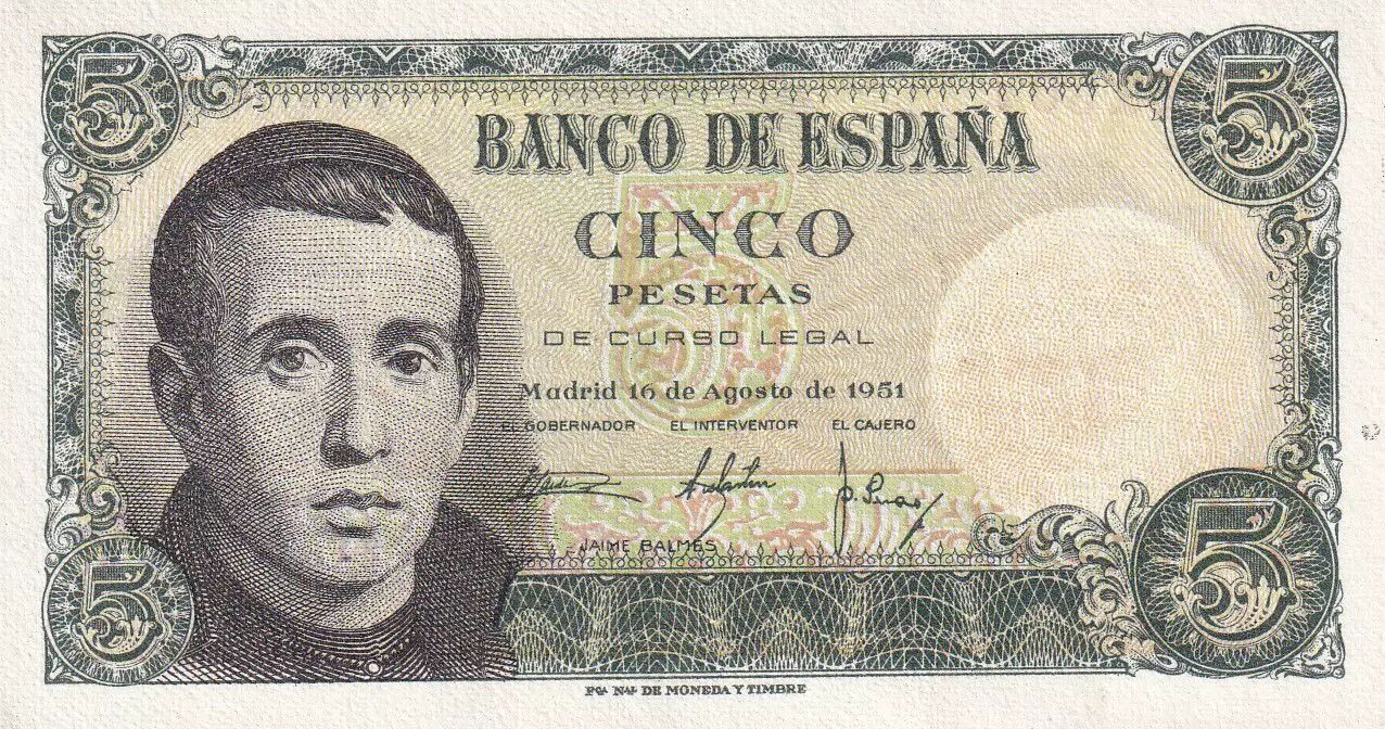 Accueil > Archivage > Espagne 5 Pestas - Jaime Balmes - 1951 - Série E - P.140