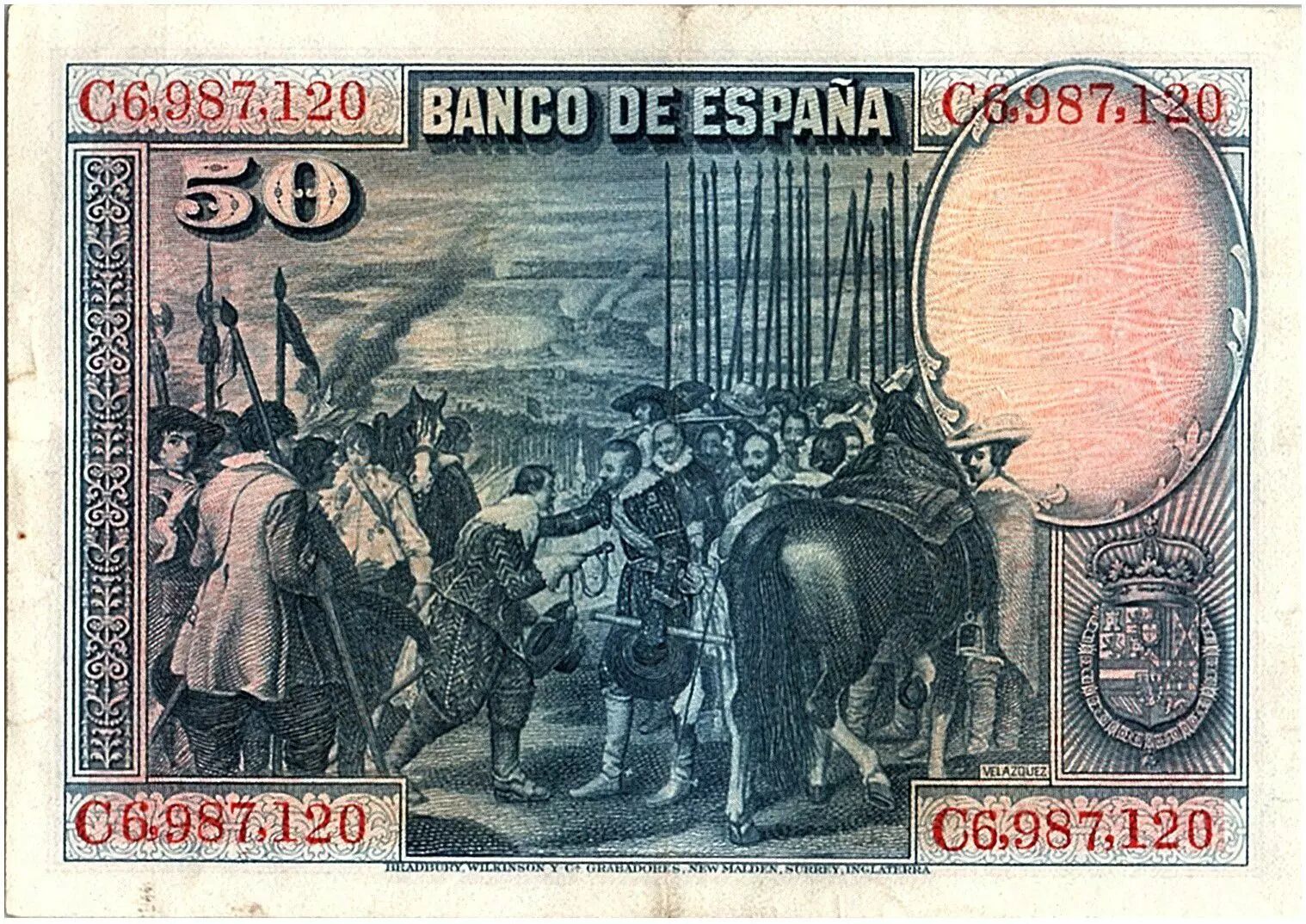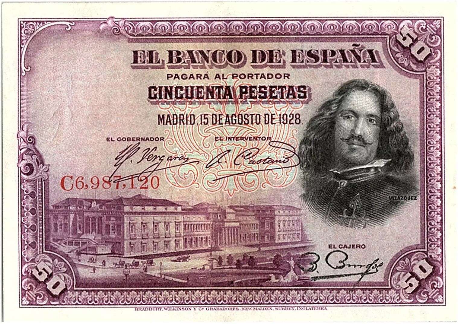 Accueil > Billets du Monde > Billets d'Europe > Espagne > Espagne 50 Pesetas - D. Vélasquez - 1928 - Série C - TTB - P.75