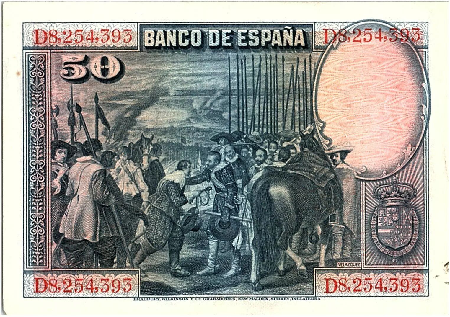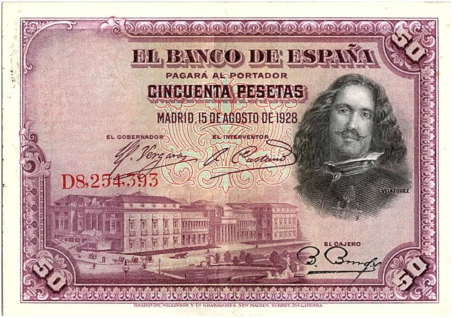 Accueil > Billets du Monde > Billets d'Europe > Espagne > Espagne 50 Pesetas - D. Vélasquez - 1928 - Série D - TTB - P.75