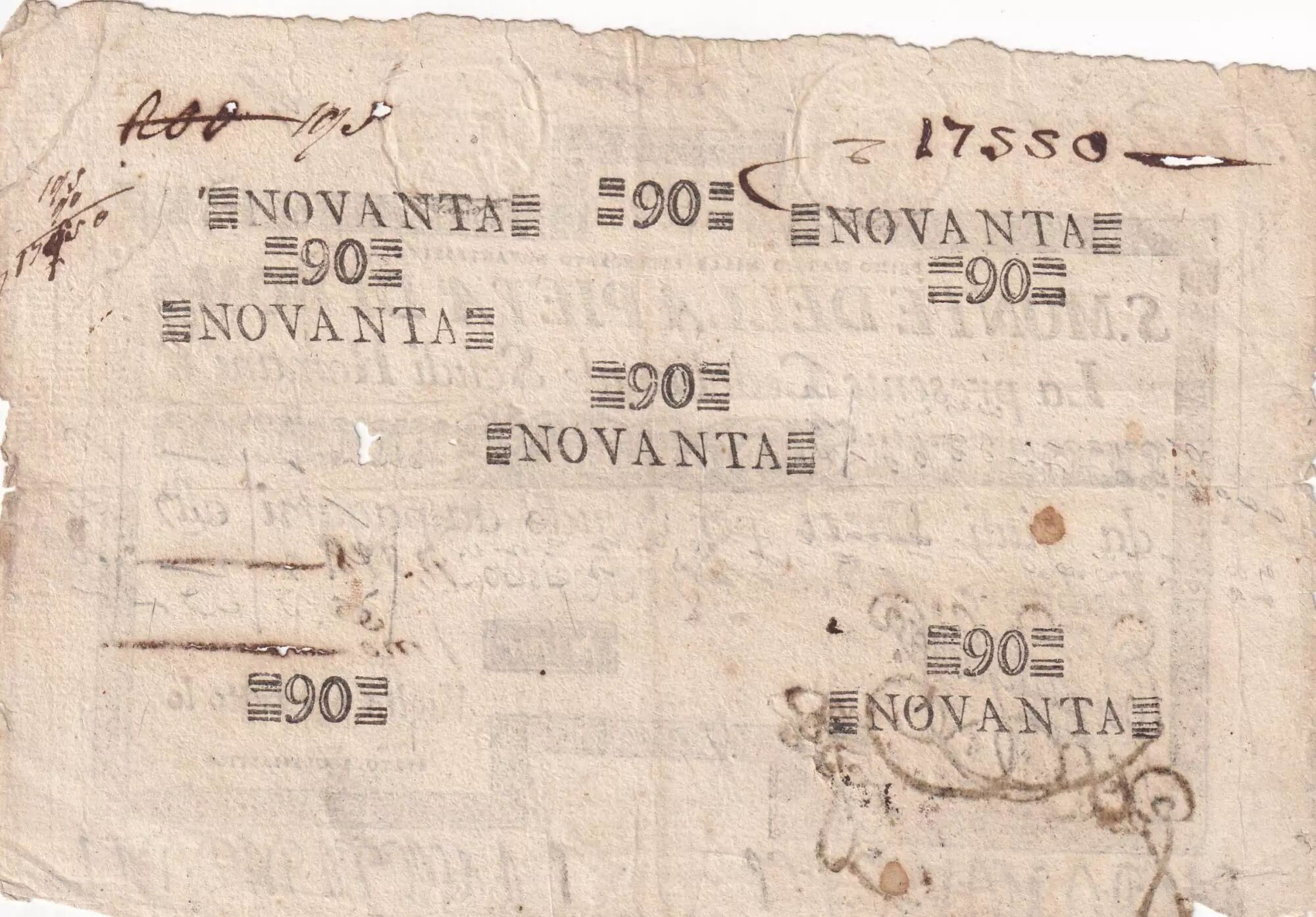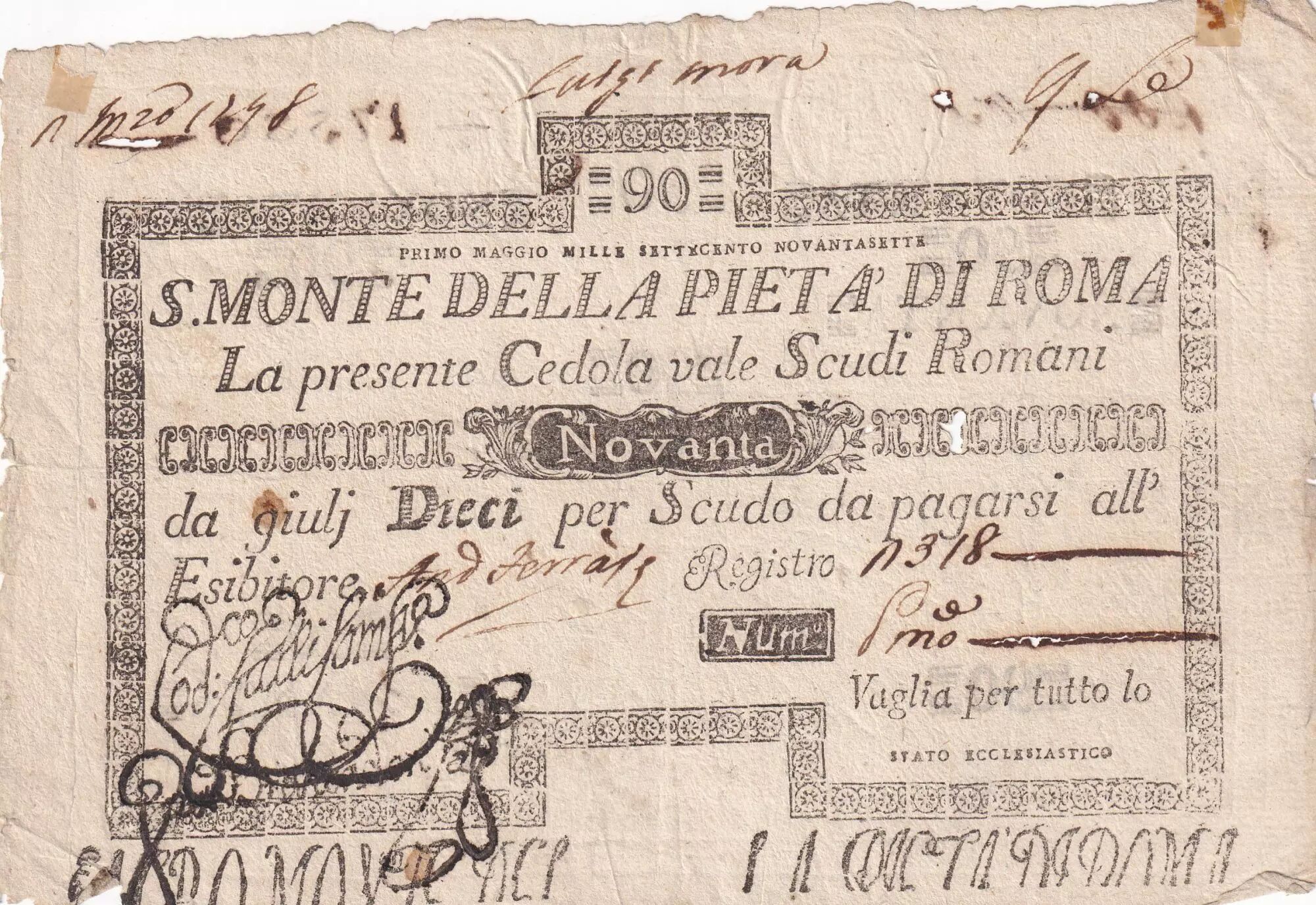 Billet Etat Pontifical 90 Scudi - Monte della Pieta Di Roma - 1797