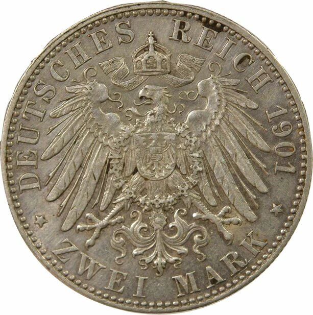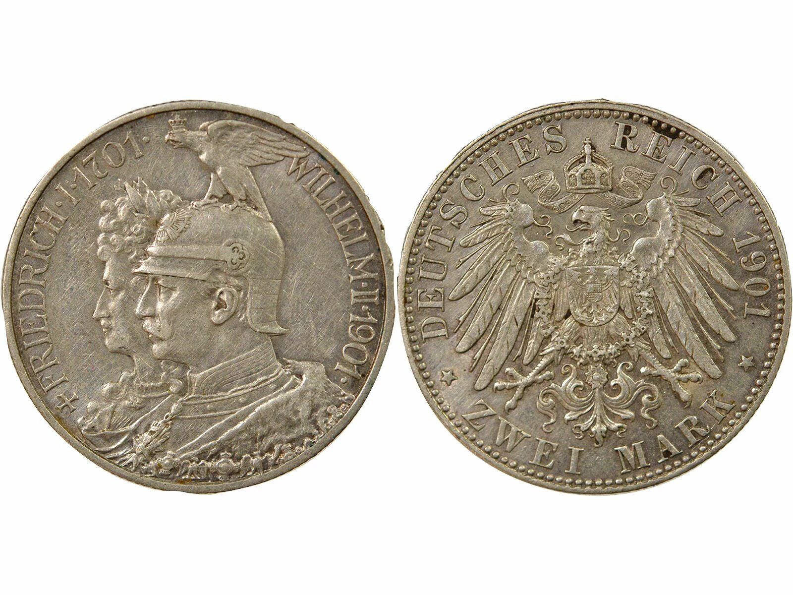 Accueil > Monnaies du monde > Monnaies d'Europe > Allemagne - Etats Allemands > Prusse > Etats Allemands (Prusse) Guillaume II - 2 Mark Argent, 200 Ans du Royaume - 1901 A Berlin