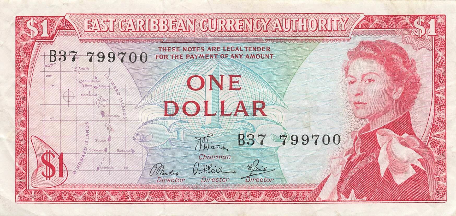 Accueil > Billets du Monde > Billets d'Amérique > Caraïbes Britannique > Etats Caraïbes orientales 1 dollar - Elisabeth II - ND (1965) - P.13d