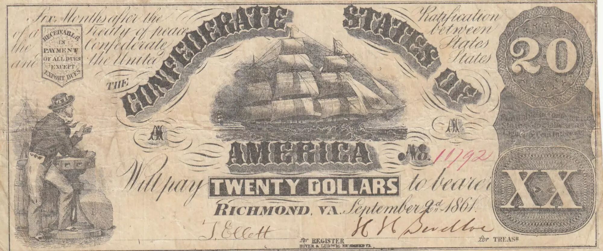 Billet Etats Confédérés d'Amérique 20 Dollars - Etats Confédérés d'Amérique - Richmond - 02-09-1861