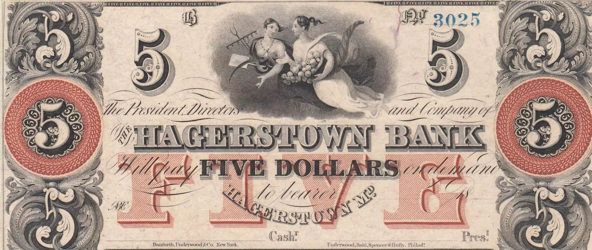 Billet Etats Confédérés d'Amérique 5 Dollars - Banque de Hagerstown - Remainder - 1850