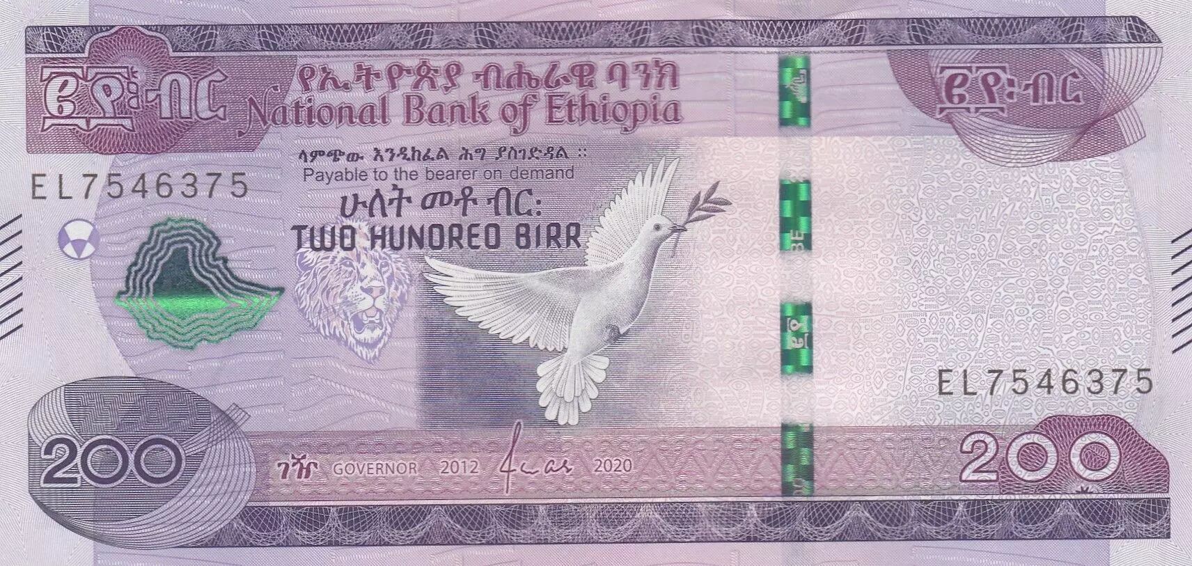 Banknote Ethiopia 200 Birr - Dove - 2020 - Serial EL