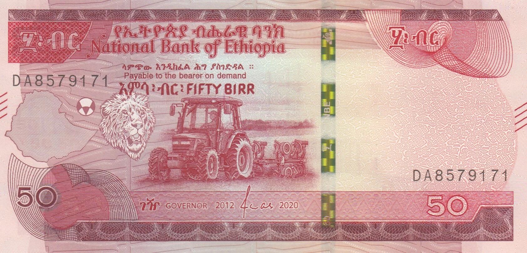 This banknote is issued by Ethiopia and has a face value of 50 birr. It dates from the year 2020 and belongs to the DA series.