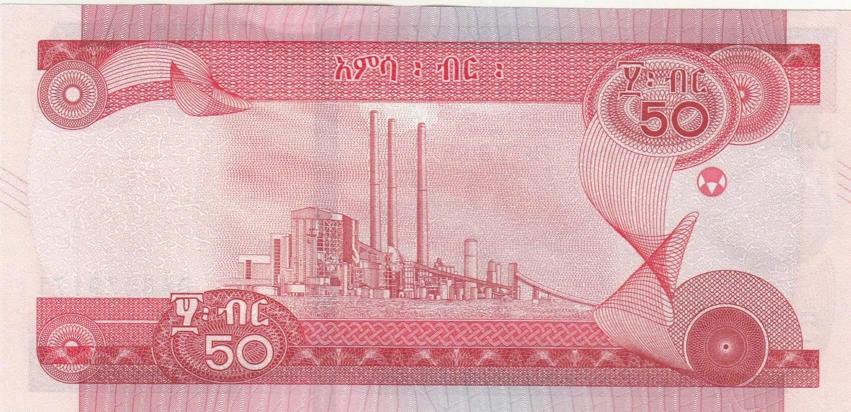 On the back, an industrial facility can be observed. This representation highlights the country's industrial development and its orientation towards modernization and economic diversification. The entire design of the banknote seeks to highlight both Ethiopia's agricultural roots and its aspiration for a prosperous industrial future.