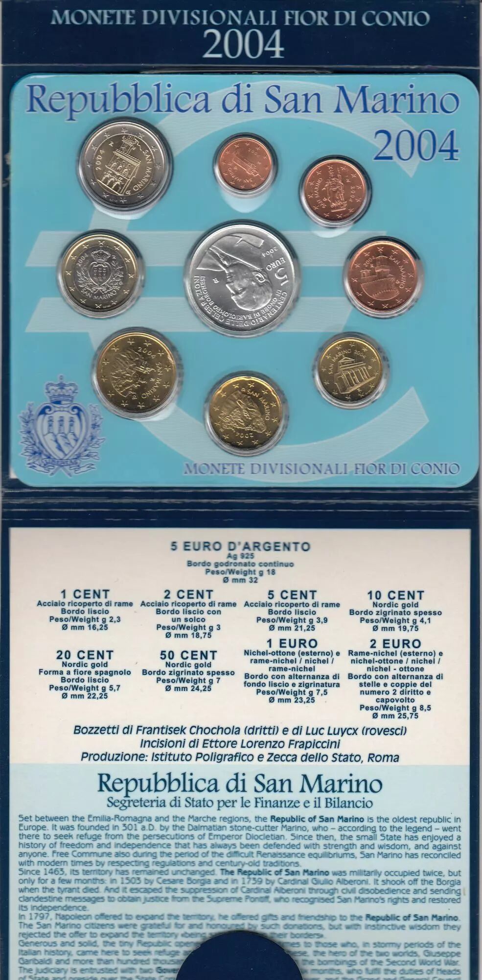 Incluing 9 coins : 1, 2, 5, 10, 20, 50 Cents - 1, 2 and 5 Euros 2004.