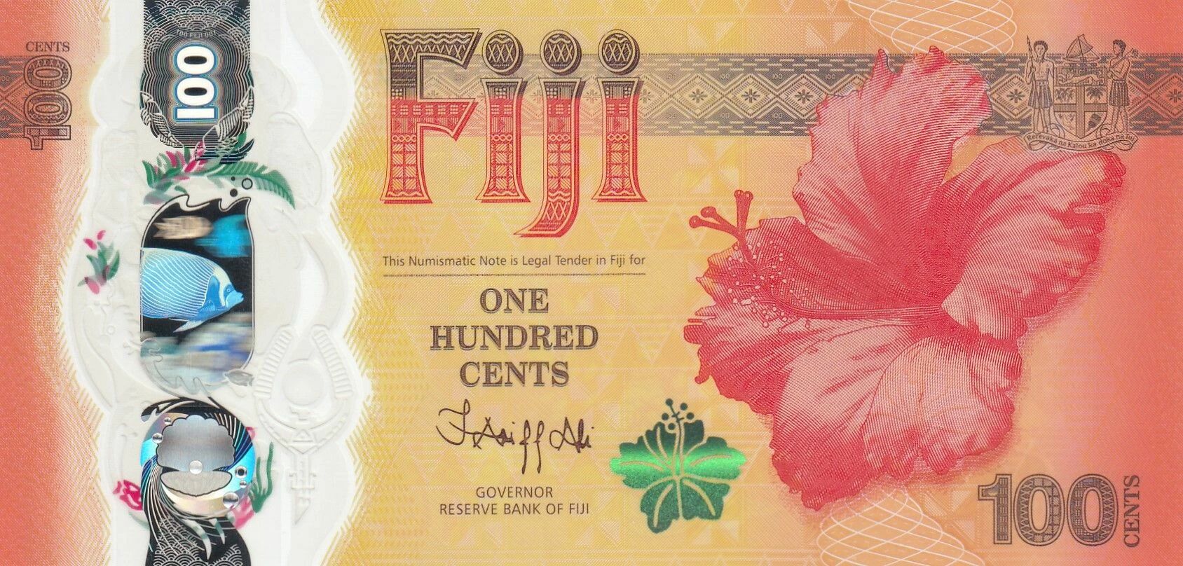 Le revers du billet arbore un dragon chinois stylisé, accompagné de nuages et d'une lanterne rouge, ainsi que le logo de l'institut bancaire émetteur. Une bande holographique complexe orne également le revers. Cette bande présente une variété d'éléments graphiques, notamment des vagues, la valeur faciale "100", des feuilles, un iguane à bandes, un loriquet à gorge rouge, des poissons, des coraux, des étoiles de mer, le logo de la Reserve Bank of Fiji (RBF), des coquillages et des perles.