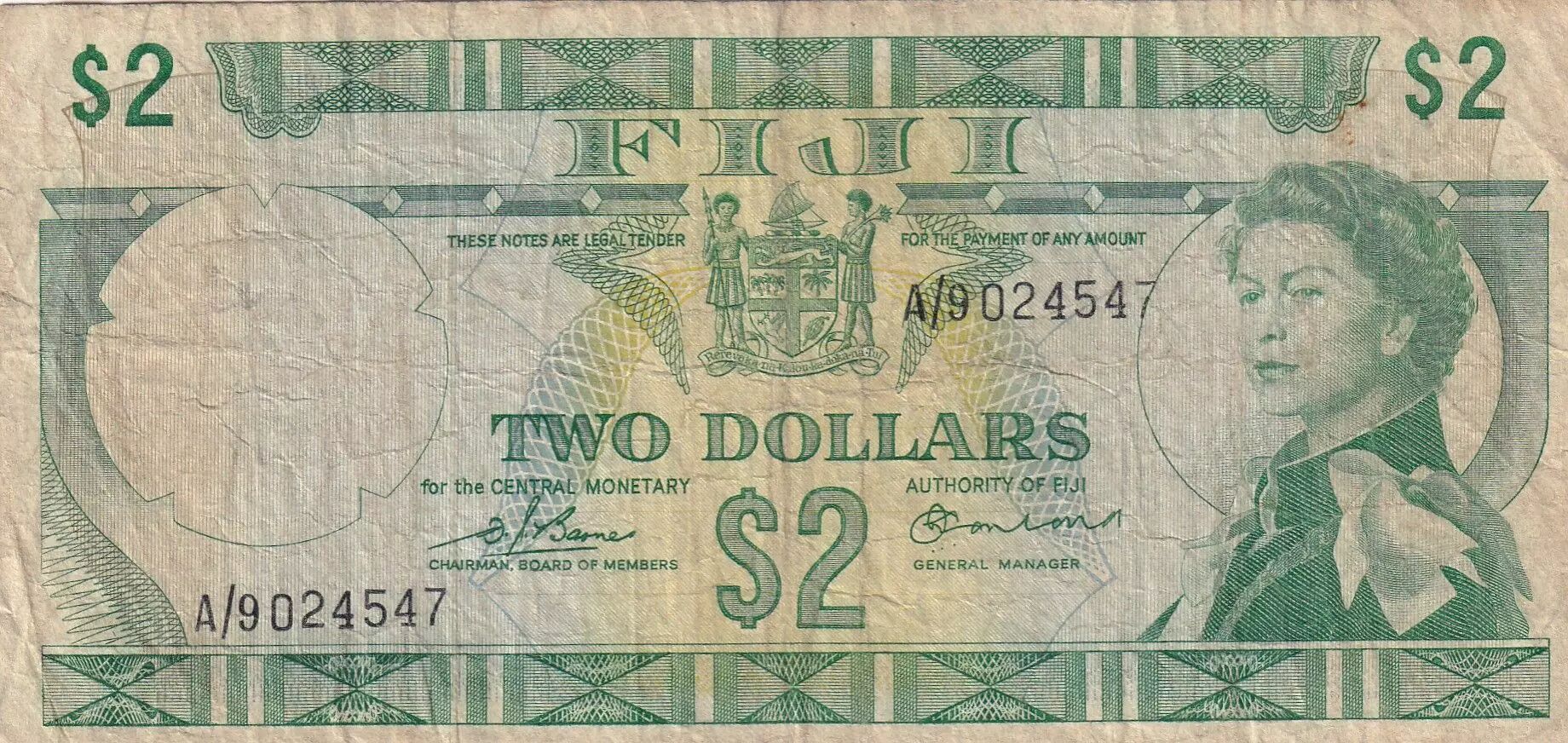 Billet Fidji 2 Dollars - Elisabeth II - 1974 - Série A/9
