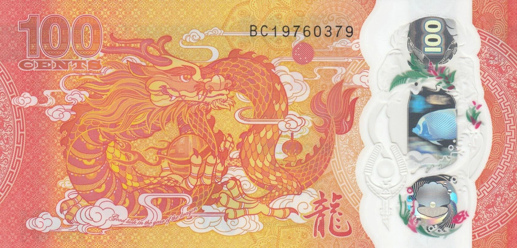The reverse of the banknote features a stylized Chinese dragon, accompanied by clouds and a red lantern, as well as the logo of the issuing banking institution. A complex holographic stripe also adorns the reverse. This stripe presents a variety of graphic elements, including waves, the face value "100", leaves, a banded iguana, a red-throated lorikeet, fish, corals, starfish, the Reserve Bank of Fiji (RBF) logo, shells and pearls.