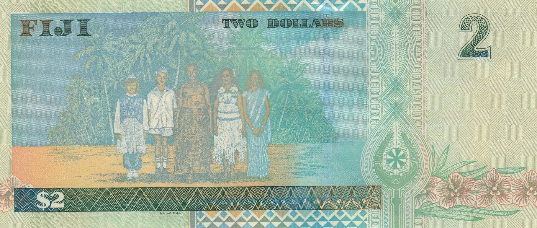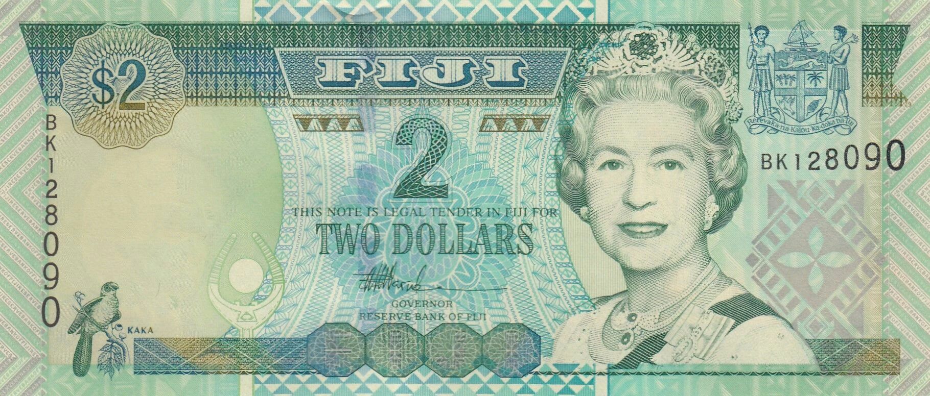 The inscriptions on the front, written in Latin, include the name of the country "FIJI", the face value "2", and the legal mention "THIS NOTE IS LEGAL TENDER IN FIJI FOR TWO DOLLARS".