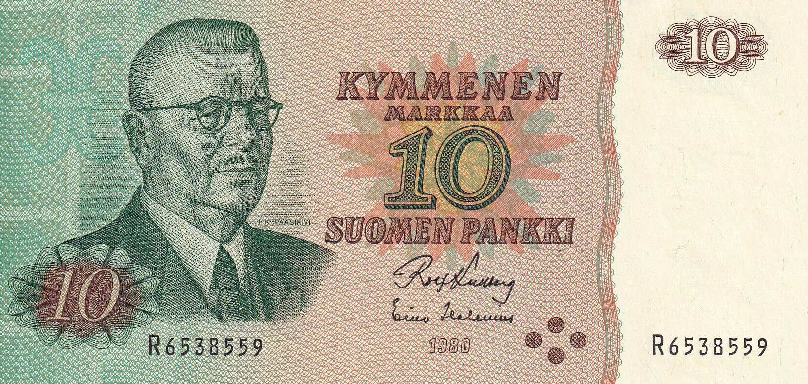 Banknote Finland 10 Markkaa Juho Kusti Paasikivi - Lion - Serial R - 1980 - P.112a