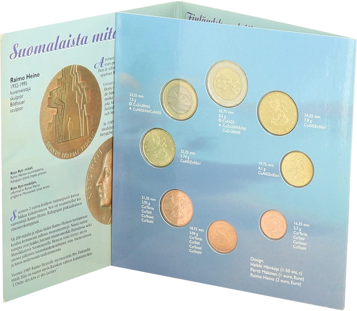 The year of issue, 1999, is visible on each coin, testifying to their origin and their belonging to the first generation of Finnish euros. The set is presented in a specially designed box to protect and showcase the coins. This box offers a neat presentation and allows for long-term preservation, making this set a valuable collector's item for numismatists and European history enthusiasts.