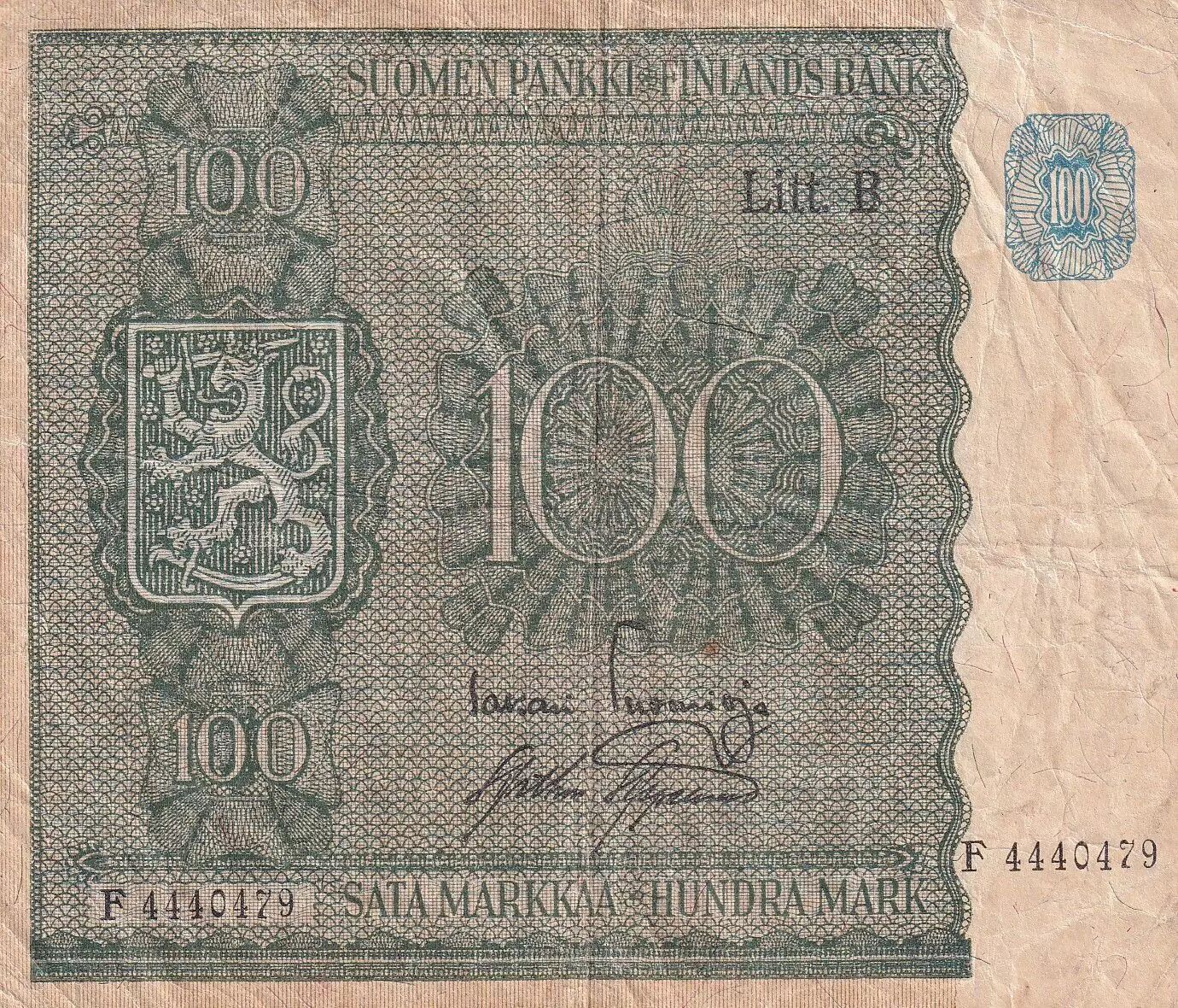 Accueil > Archivage > Finlande 100 Markkaa - Bleu & vert - Litt B - 1945 (1948) - P.88