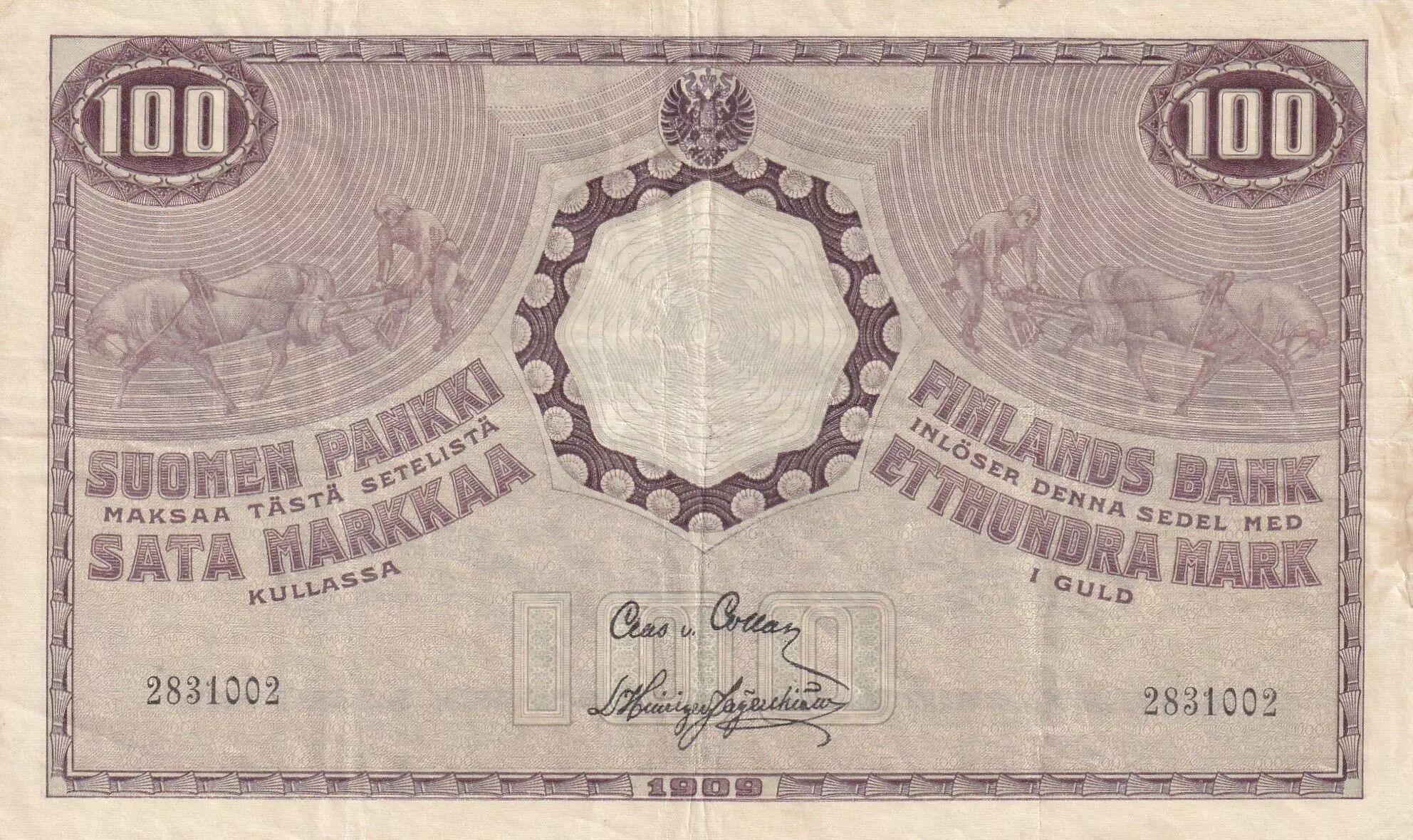 Billet Finlande 100 Markkaa Paysan et Chevaux - 1909 (ND 1918)
