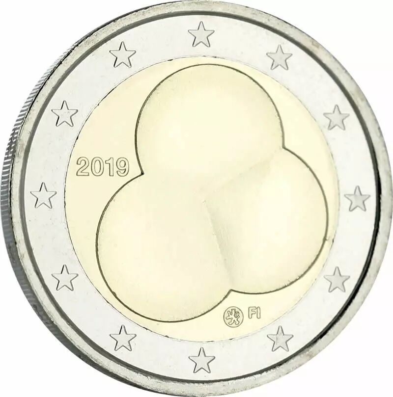 Après de difficultés d'émission liées à un changement de distributeur la Finlande a émis sa 2 euros 2019 consacrée aux 100 ans de la Constitution. Les trois cercles fusionnées représentent les trois pouvoirs (executive législative et judiciaire) à la fois indépendant et équilibrés entre eux.
