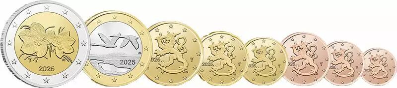 Les pièces en euro de la Finlande ont trois dessins différents : le lion héraldique finlandais sur les pièces de 1 à 50 cents le vol de deux cygnes sur les pièces de 1 euros et baie et fleurs de lakka (ou mûre des marais) sur les pièces de 2 euros. Pour la première fois depuis que la Finlande a confié la frappe des monnaies aux Pays-bas, on retrouve sur ces pièces le différent néerlandais (Caducée)