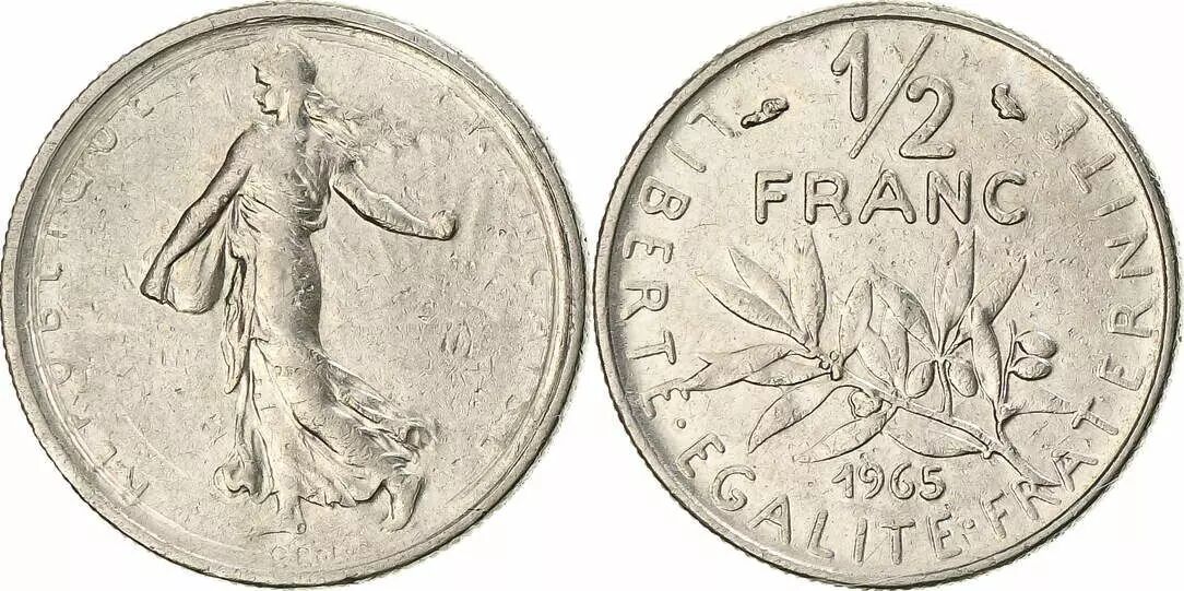 La pièce de monnaie de 50 centimes, communément appelée ½ franc Semeuse, est une pièce française frappée en 1965. Sa composition est en nickel, lui conférant une couleur argentée.