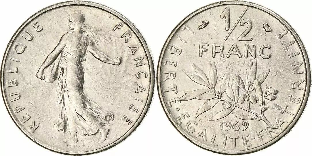 The 50 centime coin, commonly known as the ½ franc Semeuse, minted in 1969, is a French coin. It has a face value of 50 centimes. This coin is made of nickel and weighs 4.5 grams. Its diameter is 19.5 millimeters.