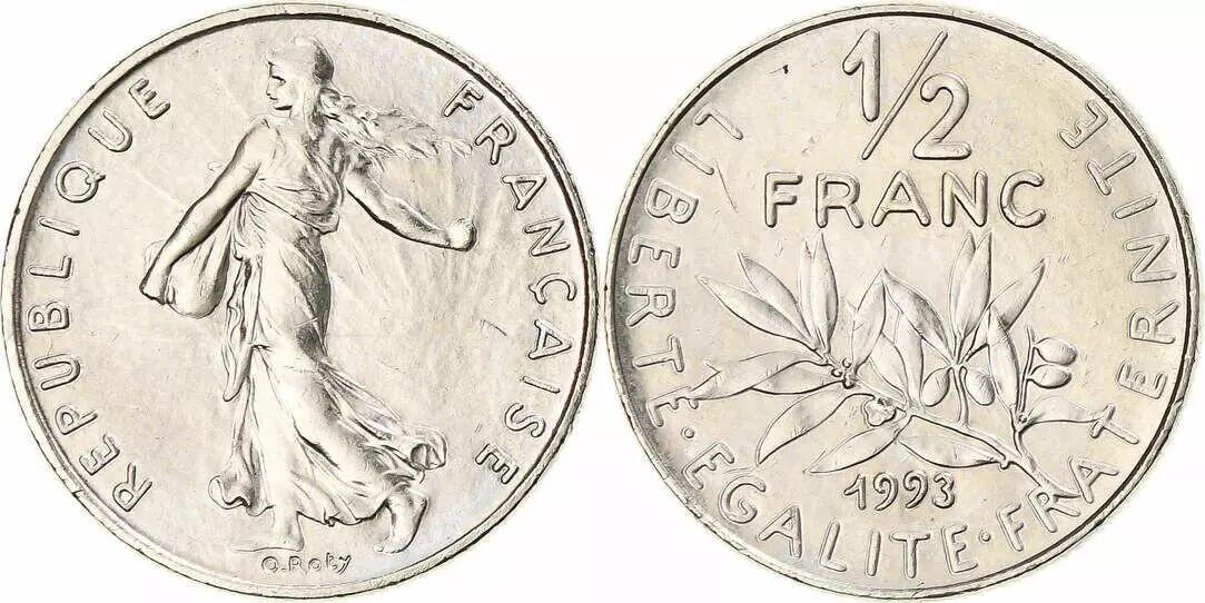 The 50-cent coin, commonly known as the ½ franc Semeuse, is a French production dating from 1993. Struck in nickel, it weighs 4.5 grams and has a diameter of 19.5 millimeters. Its edge is reeded.