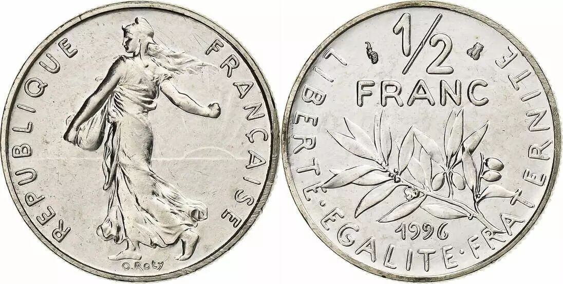 Le revers de la pièce met en scène un rameau d'olivier, symbole de paix et de prospérité. La valeur faciale, "1/2 FRANC", est inscrite au centre du motif. La devise républicaine "LIBERTE ? EGALITE ? FRATERNITE" encercle l'ensemble, rappelant les valeurs fondamentales de la nation française. Le graveur responsable de ce côté de la pièce est également Louis-Oscar Roty.