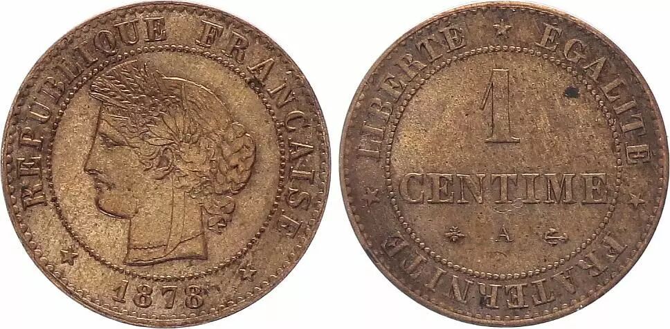 The 1 centime Ceres 1878 A coin, minted in Paris (identified by the letter "A"), is part of the bronze coinage of the French Third Republic. It weighs approximately 1 gram and measures 15 mm in diameter. The obverse depicts the bust of Ceres, Roman goddess of agriculture, wearing a crown composed of ears of wheat, oak leaves and olive branches, surrounded by the legend "RÉPUBLIQUE FRANÇAISE". The reverse features the value "1 CENTIME", the year "1878", the mint mark "A", and a laurel wreath encircling the inscription. The anchor privy mark, visible under the date, identifies the general engraver Jean Lagrange, still in office at the Paris Mint during this period.