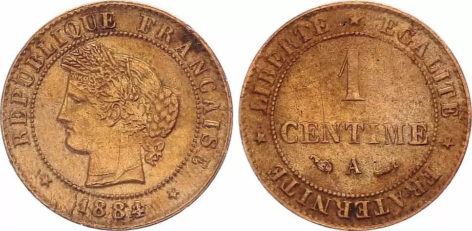 La pièce de 1 centime Cérès 1884 A, frappée à Paris (atelier identifié par la lettre "A"), fait partie des émissions en bronze de la Troisième République française. Elle pèse environ 1 gramme et mesure 15 mm de diamètre. L?avers montre le buste de Cérès, déesse romaine de l?agriculture, coiffée d?une couronne d?épis, de feuilles de chêne et d?olivier, entourée de la légende "RÉPUBLIQUE FRANÇAISE". Le revers présente la valeur "1 CENTIME", l?année "1884", la lettre d?atelier "A", ainsi qu?un faisceau de licteur placé sous la date, symbole de l?autorité républicaine. L?inscription est entourée d?une couronne de laurier. Ce différent en faisceau distingue cette variante du graveur général Jean Lagrange.