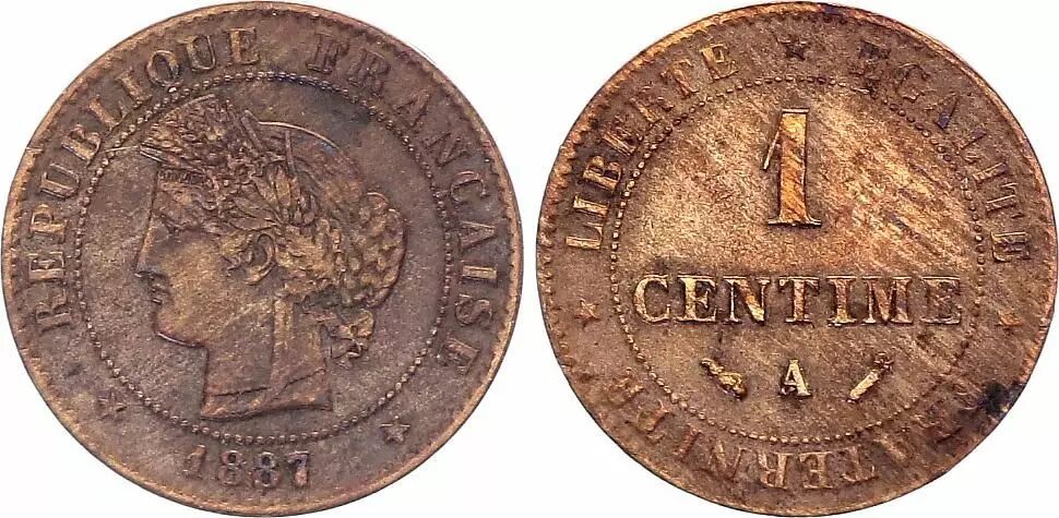 The 1887 A Ceres 1 centime coin, minted in Paris (workshop identified by the letter "A"), is part of the bronze issues of the French Third Republic. It weighs approximately 1 gram and measures 15 mm in diameter. The obverse features the bust of Ceres, Roman goddess of agriculture, wearing a crown of ears of wheat, oak leaves, and olive branches, surrounded by the legend "RÉPUBLIQUE FRANÇAISE". The reverse indicates the value "1 CENTIME", the year "1887", the mint mark "A", and a fasces placed under the date, a symbol of republican authority. A laurel wreath frames the inscription. This fasces privy mark identifies a variant engraved by Jean Lagrange.