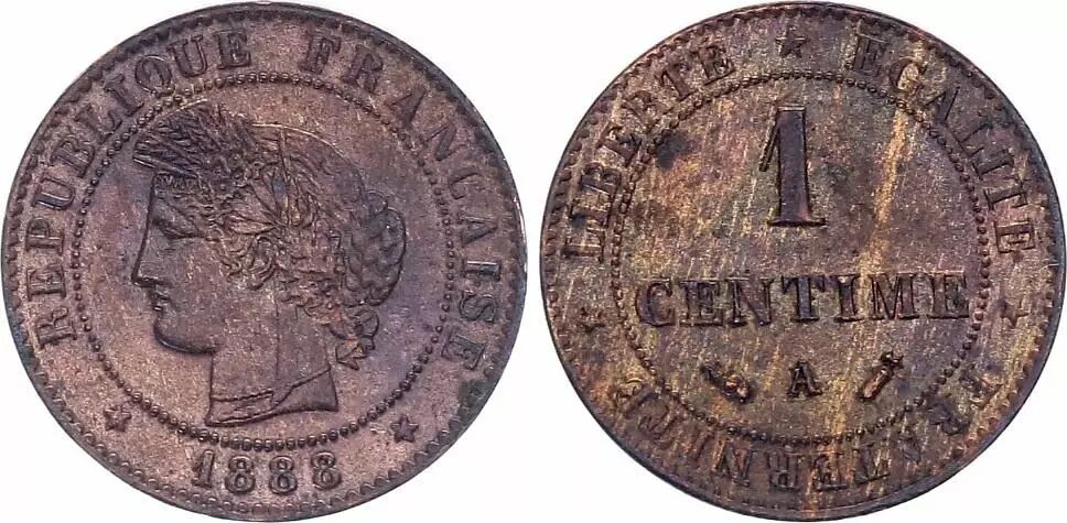 La pièce de 1 centime Cérès 1888 A, frappée à Paris (atelier identifié par la lettre "A"), appartient aux émissions en bronze de la Troisième République française. Elle pèse environ 1 gramme et mesure 15 mm de diamètre. L?avers présente le buste de Cérès, déesse romaine de l?agriculture, coiffée d?une couronne d?épis, de feuilles de chêne et d?olivier, entourée de la légende "RÉPUBLIQUE FRANÇAISE". Le revers indique la valeur "1 CENTIME", l?année "1888", la lettre d?atelier "A", ainsi qu?un faisceau de licteur placé sous la date, symbole d?autorité républicaine. Une couronne de laurier encadre l?inscription. Ce différent en faisceau caractérise une variante gravée par Jean Lagrange