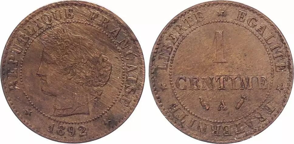 The 1892 A Ceres 1 centime coin, minted in Paris (workshop identified by the letter "A"), belongs to the bronze issues of the French Third Republic. It weighs approximately 1 gram and measures 15 mm in diameter. On the obverse, the bust of Ceres, Roman goddess of agriculture, is adorned with a crown of ears of wheat, oak leaves, and olive branches, surrounded by the legend "RÉPUBLIQUE FRANÇAISE". The reverse bears the value "1 CENTIME", the year "1892", the mint mark "A", and a fasces placed under the date, a symbol of republican authority. A laurel wreath frames the inscription. This fasces privy mark characterizes a variant engraved by Jean Lagrange.