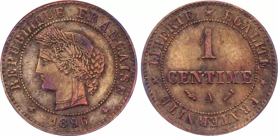 La pièce est un centime de franc français, frappée en 1896 à l'atelier monétaire de Paris, identifié par la lettre "A". Elle est en bronze.