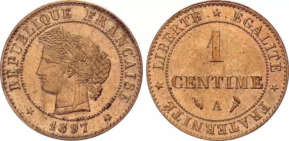 La pièce de 1 centime Cérès 1897 A, frappée à Paris (atelier identifié par la lettre "A"), fait partie des dernières frappes en bronze de la Troisième République française pour cette dénomination. Elle pèse environ 1 gramme et mesure 15 mm de diamètre. L?avers représente le buste de Cérès, déesse romaine de l?agriculture, coiffée d?une couronne composée d?épis, de feuilles de chêne et d?olivier, entourée de la légende "RÉPUBLIQUE FRANÇAISE". Le revers indique la valeur "1 CENTIME", l?année "1897", la lettre d?atelier "A", et un différent en forme de torche placé sous la date, symbole utilisé par le graveur général Henri-Auguste Patey, successeur de Jean Lagrange. L?ensemble est encerclé par une couronne de laurier.
