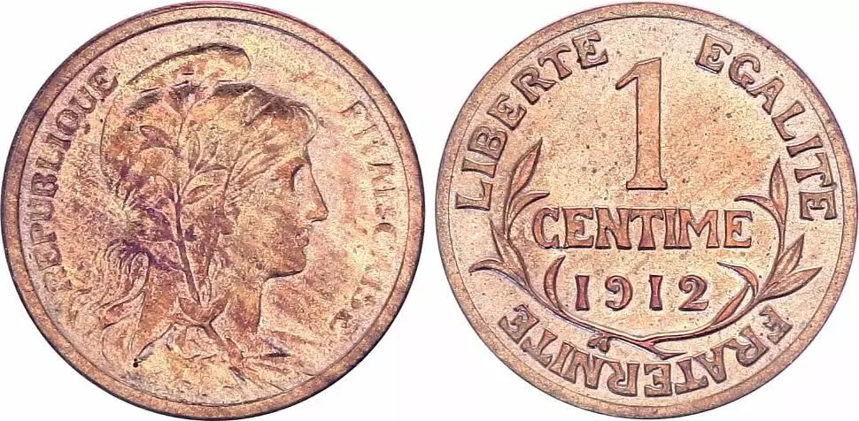 Le revers de la pièce indique la valeur nominale "1 CENTIME" au centre, avec le millésime "1912" situé en dessous. L'ensemble est entouré d'une branche d'olivier, symbole de paix et de prospérité. La devise républicaine "LIBERTE EGALITE FRATERNITE" est inscrite en lettres capitales sur le pourtour de la pièce, encadrant la valeur nominale et le millésime. Le nom du graveur, Jean-Baptiste-Daniel Dupuis, est associé à la conception des deux faces de la pièce.