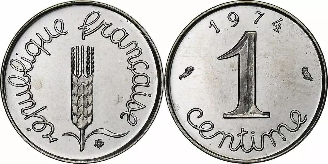The reverse of the coin displays the face value, the number 1, predominating in the center. This value is complemented by the indication of the unit, "centime", also in cursive script, and the year of minting, 1974. Marcel Guilleminet is also the designer of this side of the coin.